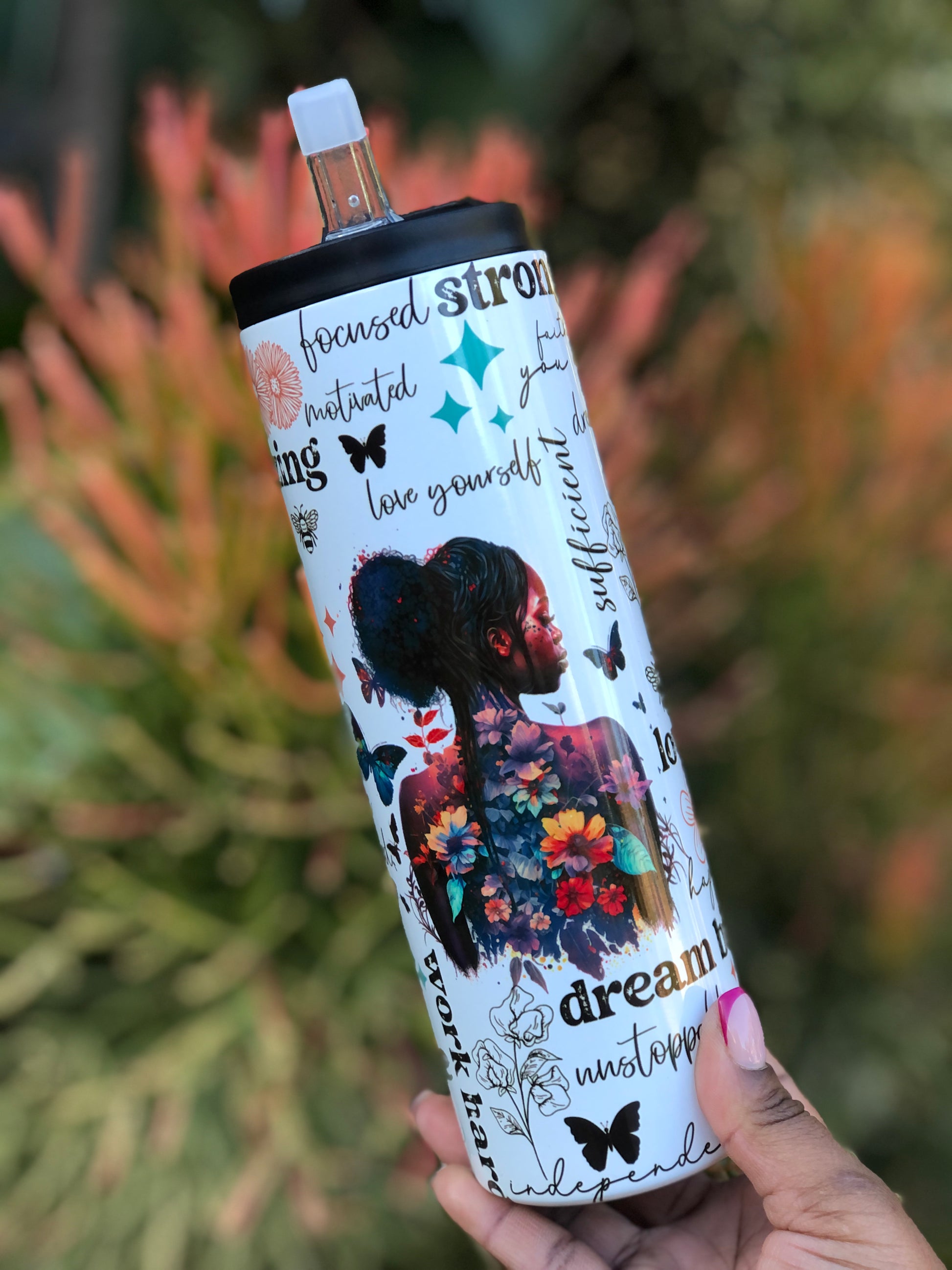 It comes with a black coaster attached to the bottom, a Flip Lid with plastic straw, a BPA-free Clear Lid, and a Metal Straw.